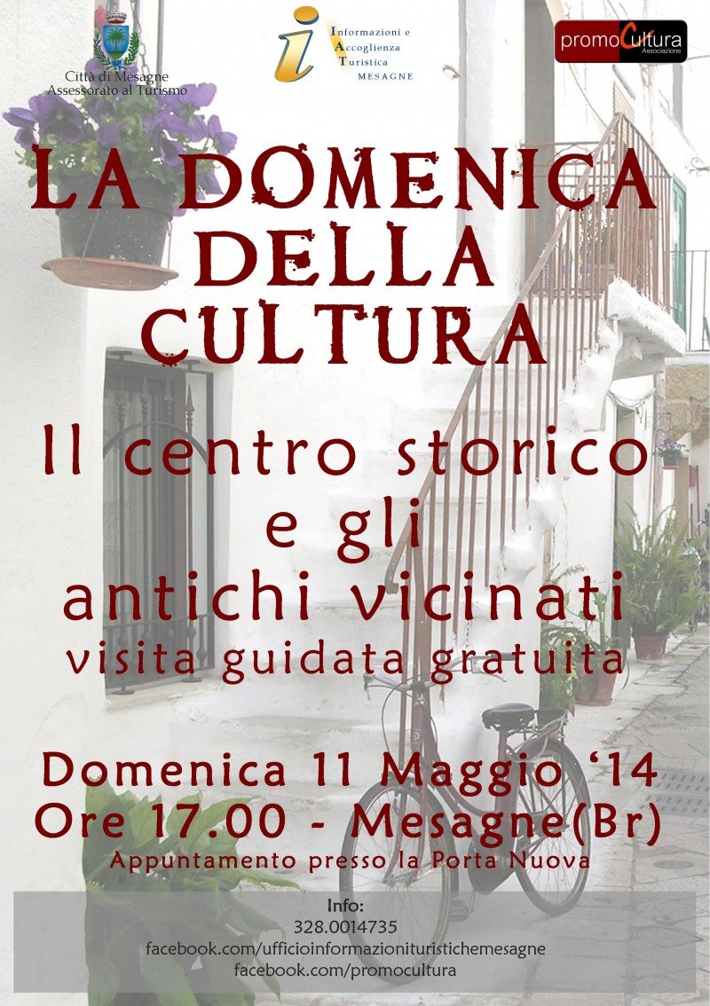 L’Ufficio Informazioni e Accoglienza Turistica (IAT), l’Assessorato al Turismo e l’Associazione promoCultura organizzano per domenica 11 maggio alle ore 17.00 “La domenica della Cultura. La visita guidata gratuita, sarà tenuta dall’esperta di storia locale Prof.ssa Melina Deleo e partirà dalla Porta Nuova ; sarà l’occasione per passeggiare nello splendido centro storico della Città e scoprire aspetti inediti o poco conosciuti.