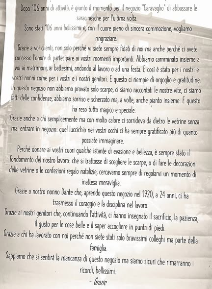 Il negozio ha accompagnato intere generazioni: dai nonni ai genitori, fino ai figli. Clienti, ma soprattutto amici, volti, storie, frammenti di vita condivisi tra una prova di scarpe e una chiacchiera. “Abbiamo camminato insieme a voi ai matrimoni, ai battesimi, andando al lavoro o a una festa”, si legge nel messaggio. Una presenza discreta e costante, capace di entrare nei momenti importanti e in quelli più ordinari.