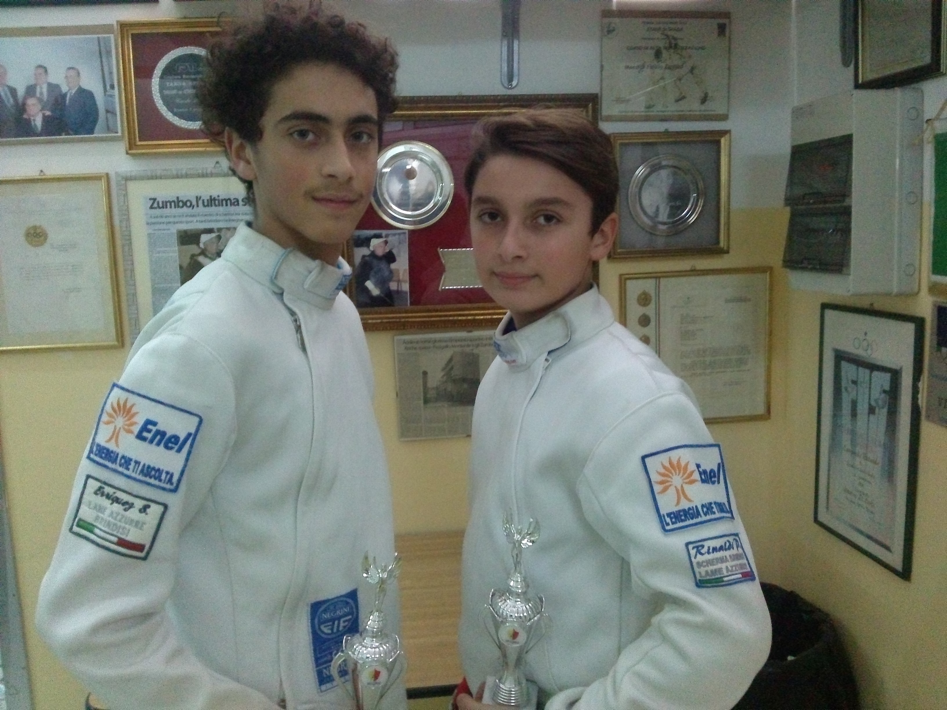 Si e’ svolta nelle giornate di sabato 22 e domenica 23 novembre 2014 a Ravenna , presso il Pala De andré la prima prova nazionale di scherma riservata alle categorie under 14 nella specialità della spada, nel corso della quale splendide sono state le prestazioni degli schermidori Samuele Erriquez nella categoria allievi e Pietro Rinaldi nella categoria ragazzi entrambi tesserati con la societa’ Enel scherma lame azzurre dei Maestri Zumbo i quali hanno conquistato il 3° posto su 170 partecipanti provenienti da ogni parte d’Italia, ottima la partenza già dai gironi per Erriquez il quale concludeva con ben 5 vittorie, lo stesso risultato per Rinaldi, superavano quattro eliminazioni dirette raggiungendo le semifinali mettendo in mostra grandi doti tecniche e caratteriali elementi fondamentali per ottenere risultati di prestigio come questo.