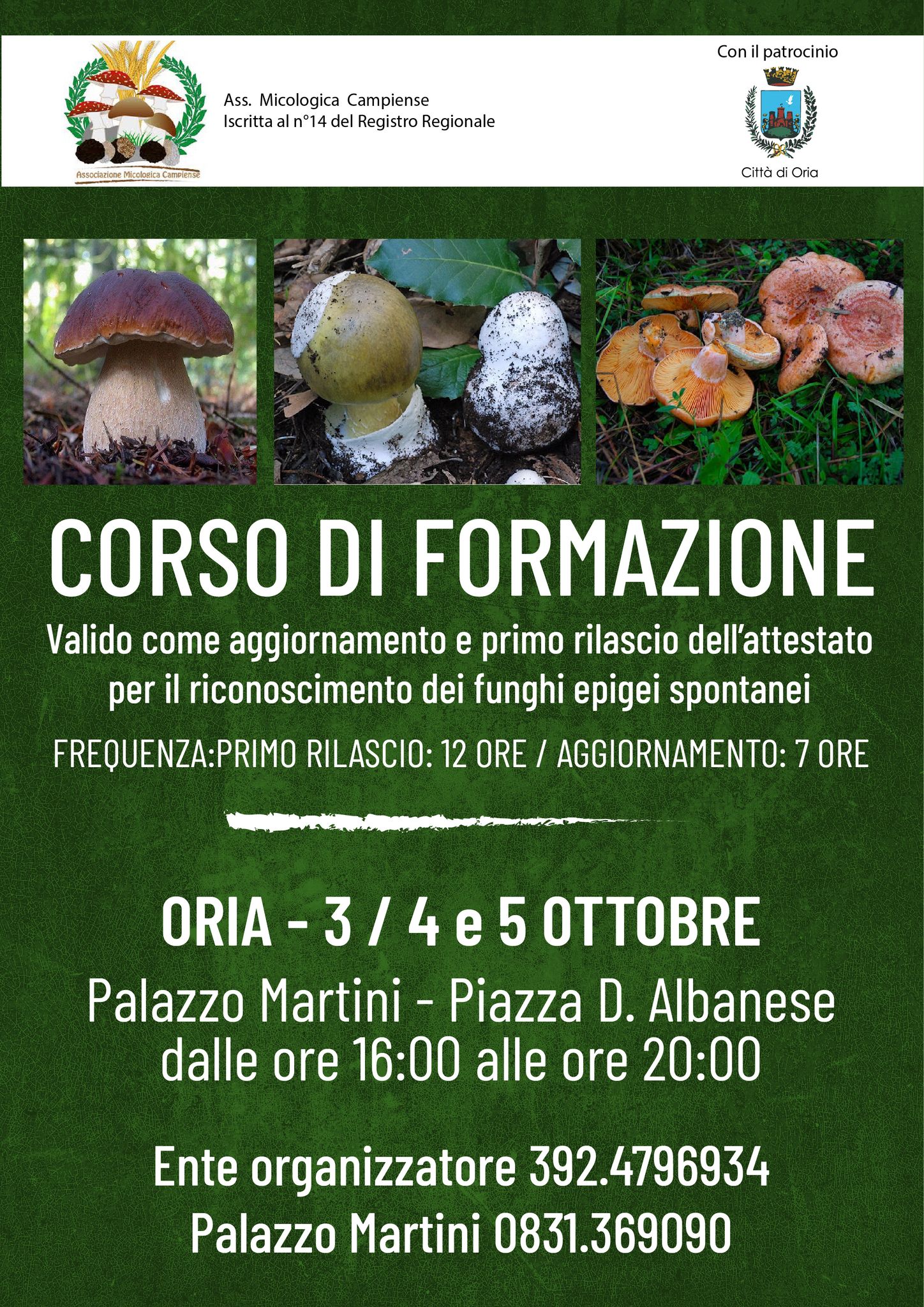 In questa ottica l’Associazione Micologica Campiense con il Patrocinio del Comune di Oria organizza un “Corso di Formazione” valido per il rilascio e l’aggiornamento del tesserino per la raccolta dei funghi epigei spontanei.