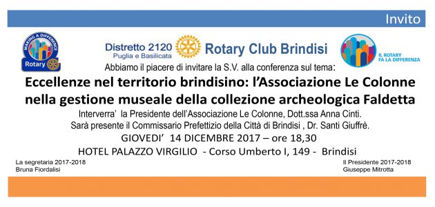 Per Giovedì 14 dicembre, presso l’Hotel Palazzo Virgilio, alle ore 18.30, il Rotary Club di Brindisi terrà una conferenza sul tema: “Eccellenze nel territorio brindisino: l’Associazione Le Colonne nella gestione museale della collezione archeologica Faldetta”.