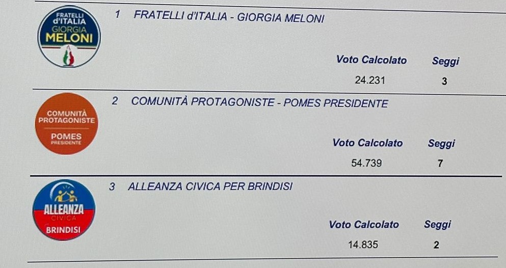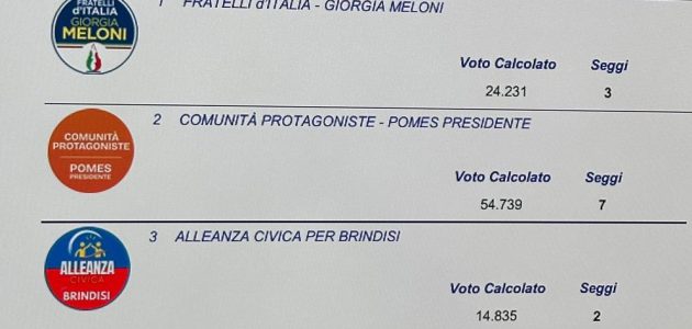 Si è concluso lo scrutinio delle elezioni per il Presidente e il Consiglio provinciale di Brindisi. A guidare l’ente sarà Angelo Pomes, sostenuto dalla lista Comunità Protagoniste – Pomes Presidente, che ha ottenuto il risultato più consistente nel voto degli amministratori locali.