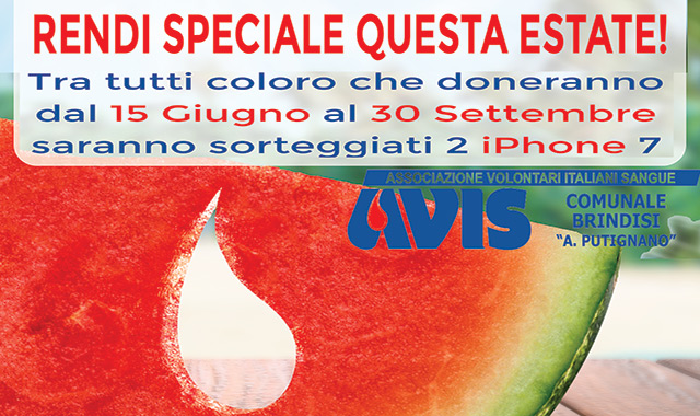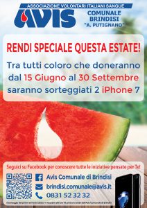 In proposito, in occasione del periodo estivo, come di consueto, l’Avis Comunale di Brindisi lancia la “Promozione Estiva 2017”: tutti coloro che doneranno il proprio sangue presso il Centro Trasfusionale dell’ospedale “A. Perrino”, dal 15 giugno al 30 settembre, concorreranno all’estrazione finale di 2 i-Phone.