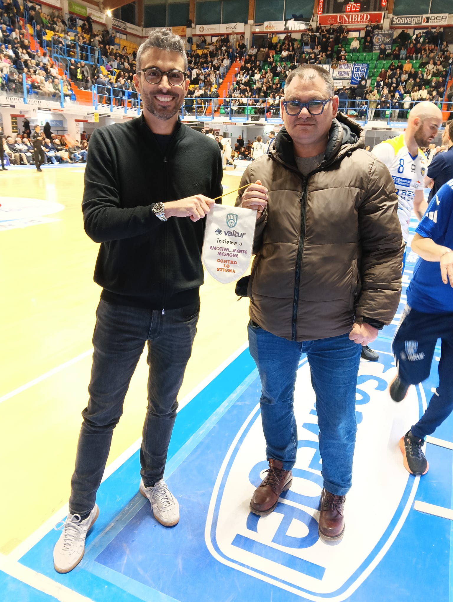 I massimi dirigenti della squadra brindisina hanno voluto fortemente che i rappresentanti dell’associazione “ Emotiva…amente Mesagne “ potessero essere presenti prima della partita casalinga con il Torino ed esponessero uno striscione “ Mettiamo in panchina l’epilessia “coinvolgendo un po’ tutti, dai tecnici, ai giocatori, al pubblico e dimostrando che da soli si va veloci ma insieme si va lontano e unendo sinergie competenze e cuore si può fare tanto per sconfiggere la incultura. I rappresentanti di “Emotiva…mente Mesagne hanno consegnato un gagliardetto ai dirigenti del Valtur Brindisi che la dice tutta sul significato della serata “la Valtur Brindisi ed Emotiva…mente Mesagne insieme contro lo stigma che l’epilessia porta con sé.