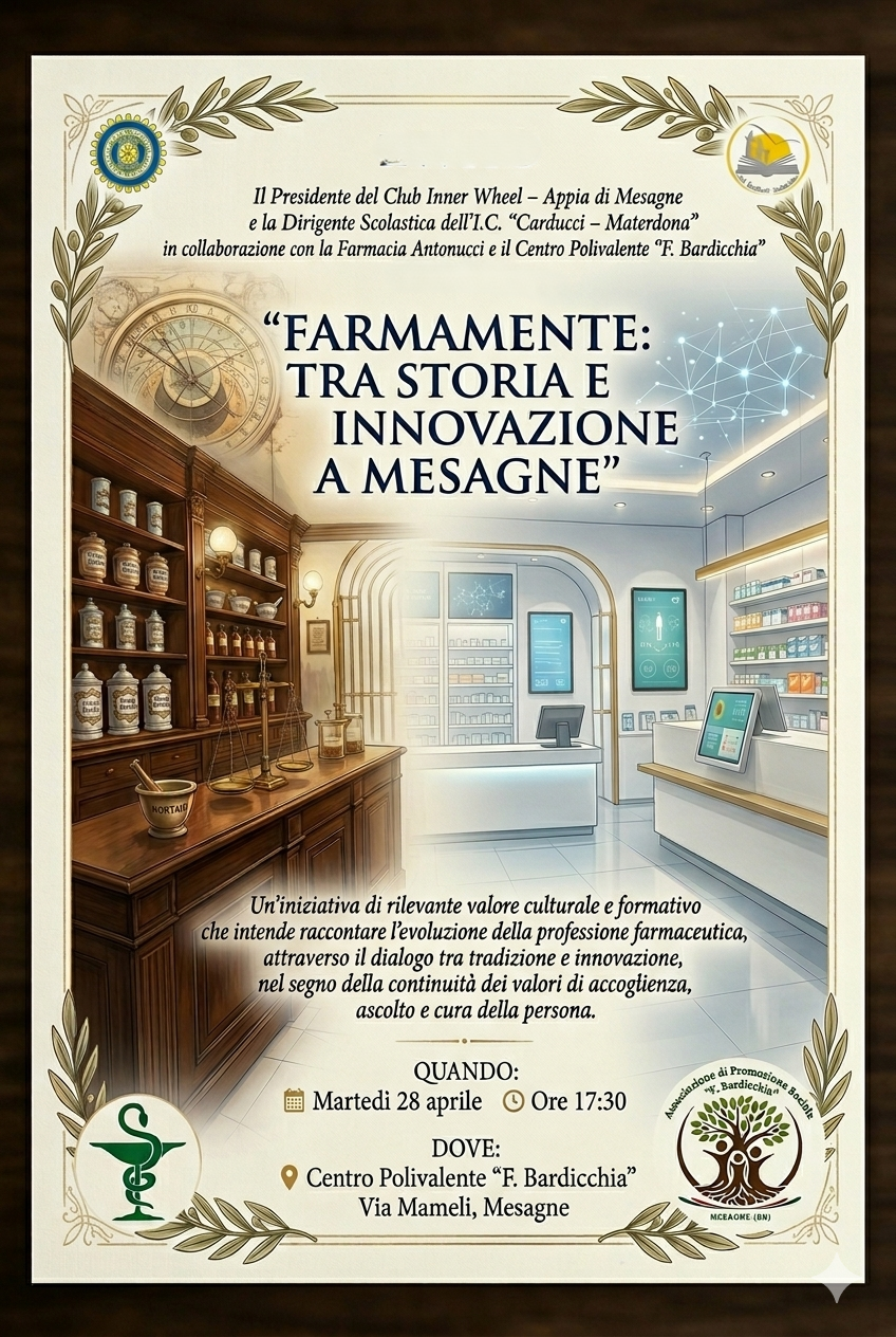 Si terrà martedì 28 aprile alle ore 17:30, presso il Centro Polivalente “F. Bardicchia”, la presentazione conclusiva del progetto innovativo “FarmaMente: tra storia e innovazione a Mesagne”, promosso dal Club Inner Wheel Appia di Mesagne e l’Istituto Comprensivo CarducciMaterdona, con la preziosa collaborazione della Farmacia Antonucci e del Centro Polivalente F. Bardicchia.