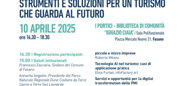 Il prossimo giovedì 10 aprile 2025 (la registrazione dei partecipanti partirà alle 14.30), si terrà nella Sala Polifunzionale de I Portici – Biblioteca di Comunità “Ignazio Ciaia” di Fasano il visioning workshop dal titolo “Digitalizzazione e sostenibilità: strumenti e soluzioni per un turismo che guarda al futuro”, organizzato da Tecnopolis Parco Scientifico e Tecnologico dell’Università degli Studi di Bari A. Moro, nell’ambito del progetto CETMA-DIHSME, in collaborazione con il Comune di Fasano e il Parco Naturale Regionale “Dune Costiere da Torre Canne a Torre S. Leonardo”.