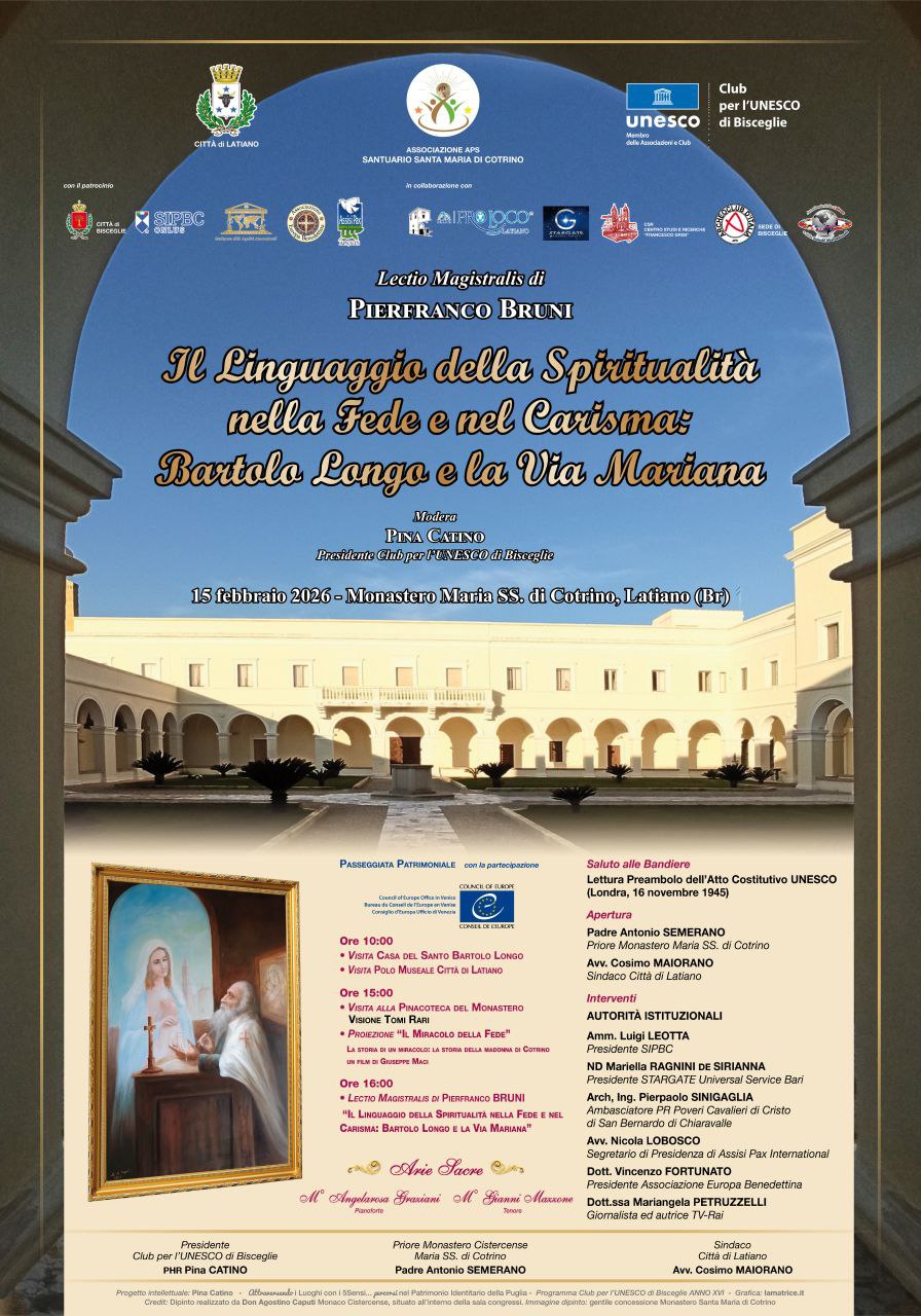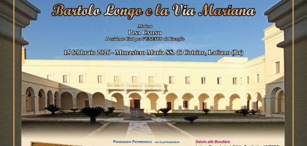– Domenica 15 febbraio 2026, la suggestiva cornice del Monastero Maria SS. di Cotrino a Latiano ospiterà un evento di alto spessore culturale e spirituale: la Lectio Magistralis di Pierfranco Bruni dal titolo “Il Linguaggio della Spiritualità nella Fede e nel Carisma: Bartolo Longo e la Via Mariana”. L’iniziativa, organizzata in collaborazione con il Club per l’UNESCO di Bisceglie e con il patrocinio della Città di Latiano, si propone come un viaggio profondo attraverso la figura del Beato Bartolo Longo, esplorandone il legame con la devozione mariana e l’impatto del suo carisma sulla spiritualità contemporanea. L’evento sarà moderato da Pina Catino, Presidente del Club per l’UNESCO di Bisceglie.