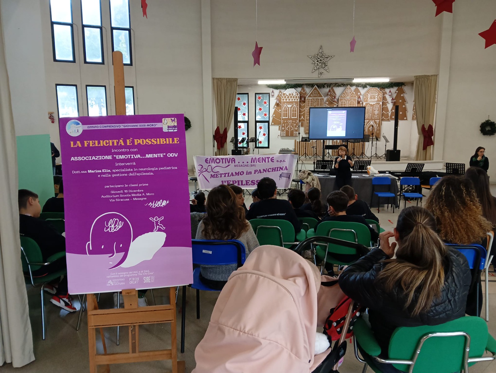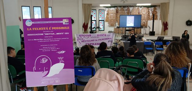 Oggi 18 dicembre nell’Auditorium della scuola media A. Moro a Mesagne, si è svolto un interessante incontro con la numerosa partecipazione degli alunni delle classi prime. Le ragazze e i ragazzi nell’ambito del progetto “La felicità è possibile”, curato dalle Professoresse Patrizia Marsano e Daniela Silvia D’Errico, si sono chiesti se anche gli adolescenti che soffrono di epilessia possono essere felici e godere di una buona qualità di vita. L’evento è stato realizzato grazie alla disponibilità del Dirigente scolastico Prof. Salvatore Fiore, che guida una scuola sempre attenta e sensibile verso le diversità. I protagonisti dell’evento hanno incontrato l’associazione “Emotiva…mente” di Mesagne che si preoccupa di promuovere una corretta conoscenza su una condizione medica diffusa e si prefigge il compito di unire energie, competenze e cuori per ricordare che l’epilessia non si affronta da soli, ma insieme.