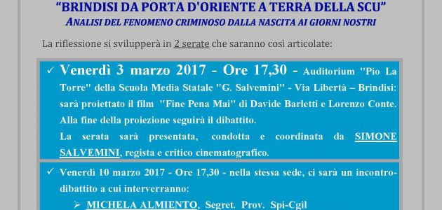 “Brindisi da porta d’Oriente a Terra della SCU” è il tema di una iniziativa culturale promossa dalle Leghe SPI CGIL cittadine e dalla Scuola di formazione politica “Antonino Caponnetto”, alla quale aderiscono: CGIL provinciale, Auser, FLC CGIL, Proteo Fare Sapere, Giovani Democratici e Unione degli studenti.