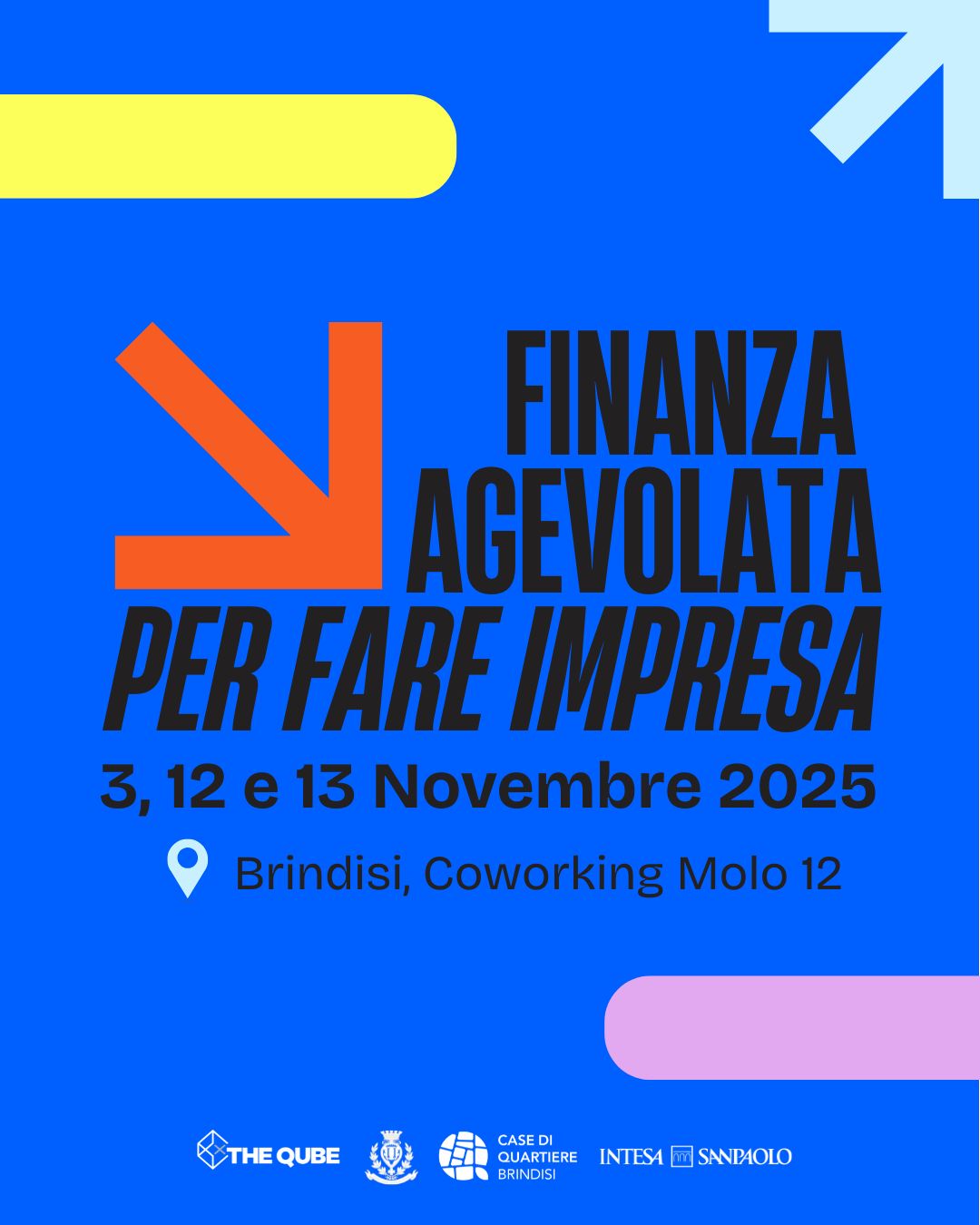 Tre appuntamenti a novembre dedicati a chi vuole innovare, crescere e investire con strumenti concreti di finanziamento agevolato. Il ciclo, promosso da The Qube Incubatore Certificato, propone tre workshop gratuiti e operativi, rivolti a imprese, professionisti e giovani del territorio, con il patrocinio del Comune di Brindisi nell’ambito del progetto Case di Quartiere e il sostegno di Intesa Sanpaolo.