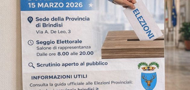 Si informa la cittadinanza che sono in programma le elezioni di secondo livello per l’elezione del Presidente della Provincia e il rinnovo del Consiglio Provinciale di Brindisi: l’appuntamento è per DOMENICA 15 MARZO 2026 presso la sede della Provincia di Brindisi in Via A. De Leo 3.