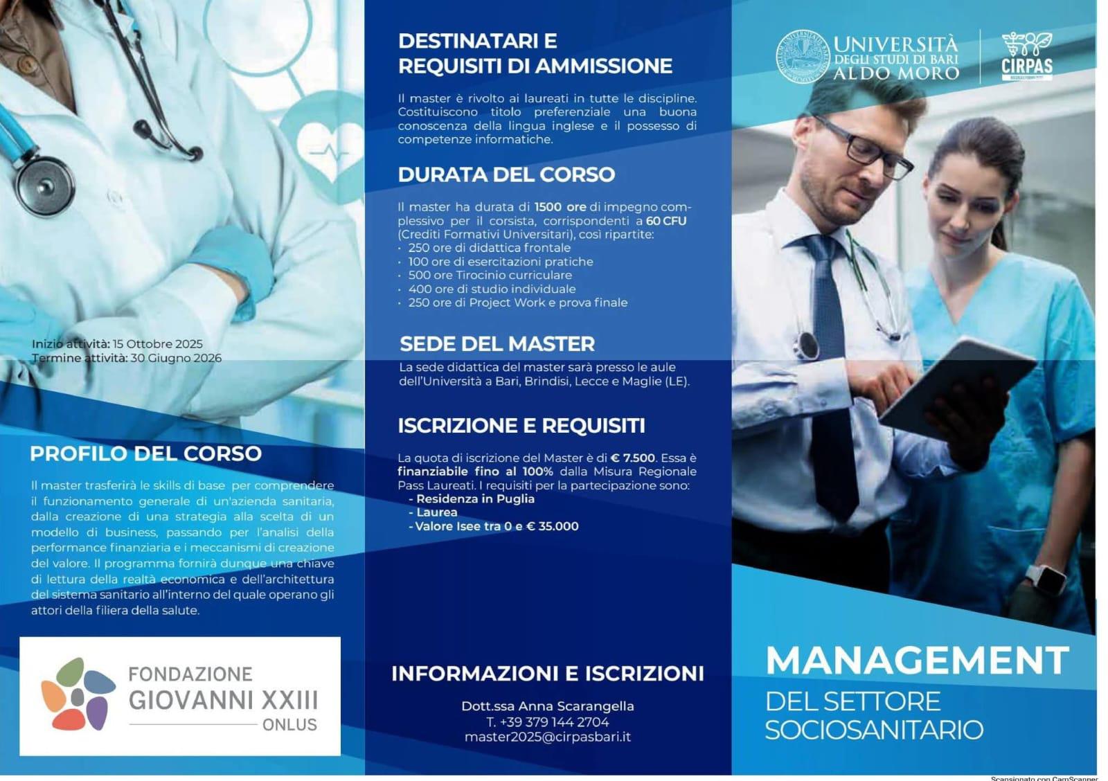 La Asl Brindisi è tra i protagonisti della nuova edizione del master universitario di I livello in Management del settore Sociosanitario, promosso dall’Università degli Studi di Bari Aldo Moro (tramite il Centro interuniversitario di ricerca Popolazione, Ambiente e Salute – CIRPAS) in collaborazione con la Fondazione Giovanni XXIII Onlus.