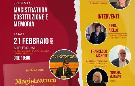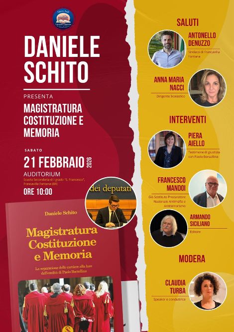 Non capita spesso che i banchi di una scuola diventino l’osservatorio privilegiato sulla storia giudiziaria del nostro Paese. Sabato 21 febbraio , alle ore 10:00 , Francavilla Fontana si trasformerà in un presidio di memoria e diritto per la presentazione del libro di Daniele Schito , “Magistratura, Costituzione e Memoria” .