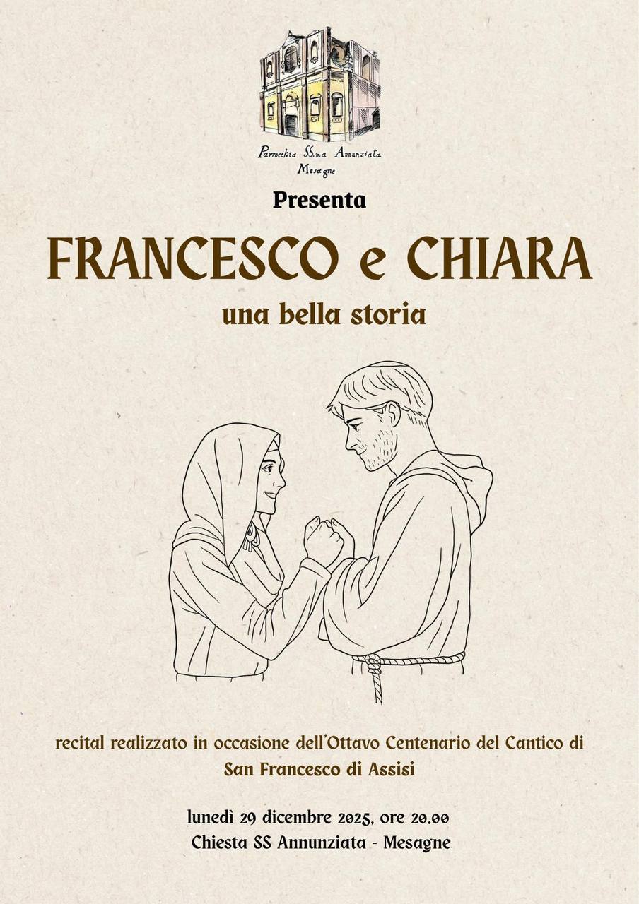 Lunedì 29 alle ore 20.30, presso la Parrocchia Ss.ma Annunziata di Mesagne, si terrà il recital “Francesco e Chiara, una bella storia”, un evento artistico e spirituale dedicato alla vita dei due santi di Assisi.
