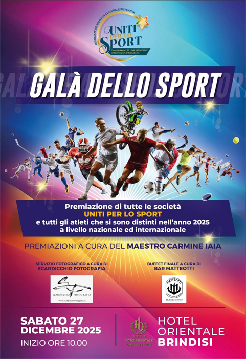 Brindisi si prepara ad accogliere la terza edizione del “Galà dello Sport” della “ASCR Uniti per lo Sport” in programma sabato 27 dicembre 2025 presso la sala Congressi dell’Hotel Orientale. Un appuntamento ormai consolidato che rappresenta un momento di incontro, riflessione e riconoscimento per le società sportive aderenti e per gli atleti che si sono distinti nel corso dell’anno sportivo 2025.