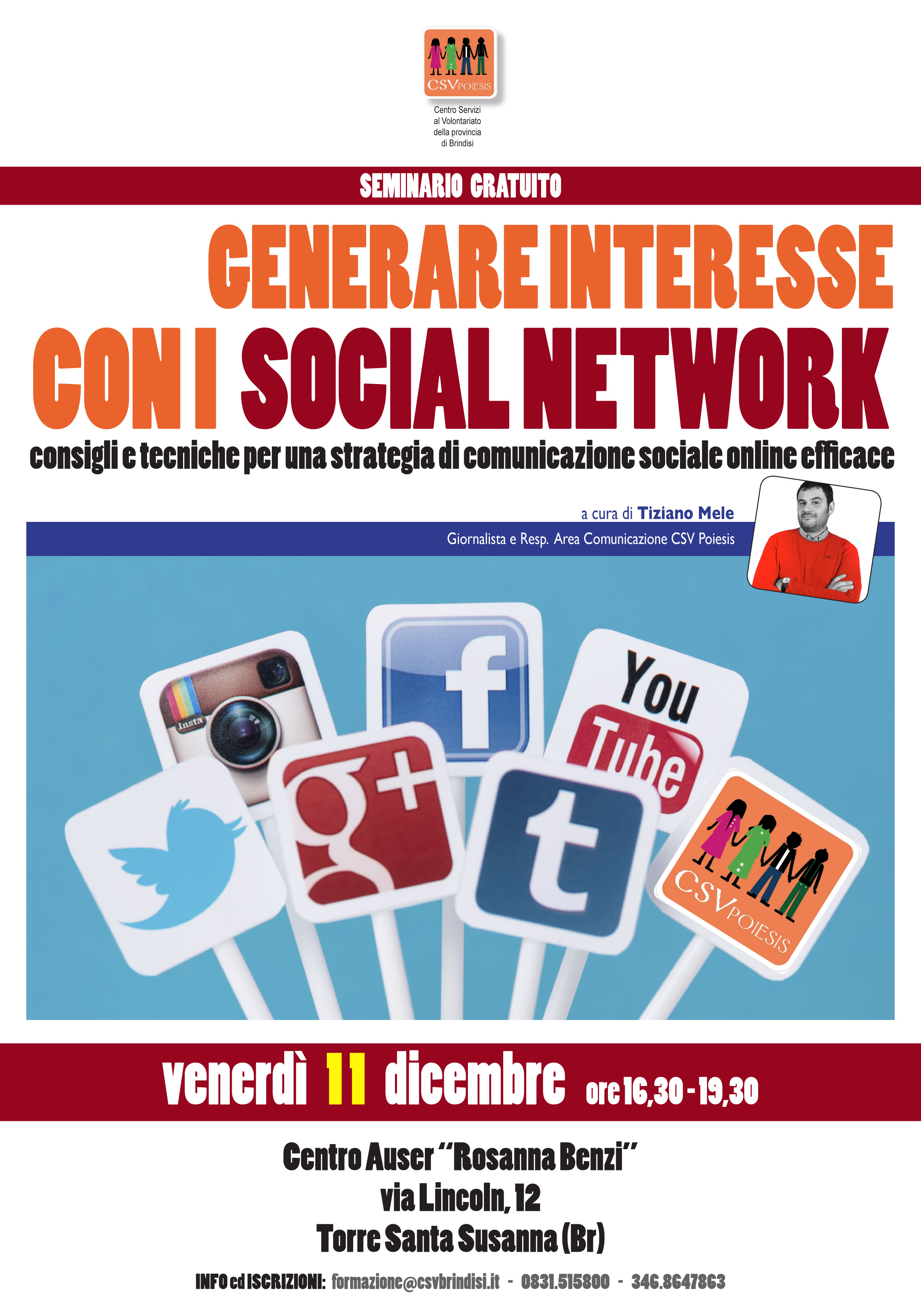 Per venire incontro alle richieste degli operatori e dei responsabili il CSV Poiesis, Centro Servizi al Volontariato della provincia di Brindisi, organizza e promuove il seminario gratuito “Generare interesse con i Social Network” della durata di 3 ore per Venerdì 11 Dicembre pv (dalle 16,30 alle 19,30) presso la sede del Centro Auser “Rosanna Benzi” (in via Lincoln, 12) a Torre Santa Susanna (Brindisi). Il seminario è rivolto principalmente a responsabili, volontari e semplici operatori di Associazioni di Volontariato, o comunque operanti nel mondo del Non Profit.
