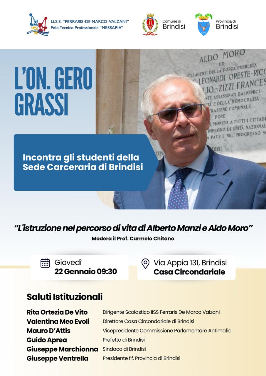 Il riscatto sociale passa attraverso l’istruzione. Giovedì 22 gennaio, alle ore 9.30, l’onorevole Gero Grassi incontrerà gli studenti della Sede Scolastica Carceraria di Brindisi. Un evento che si preannuncia dal profondo valore civile, dedicato al tema: «L’istruzione nel percorso di vita di Alberto Manzi e Aldo Moro».