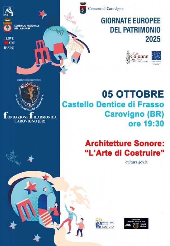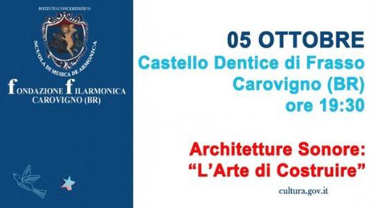 Il Castello Dentice di Frasso di Carovigno (BR) apre le proprie porte in occasione delle Giornate del Patrimonio Culturale, posticipate a domenica 5 ottobre dalle ore 19.30 alle ore 20.30, per l’Open Day Music “Architettura Sonore” a cura della Fondazione Filarmonica di Carovigno (BR).