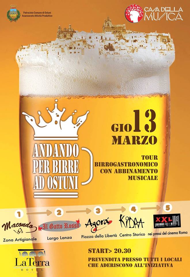 Prossimo appuntamento: “Andando per Birre, Tutto in una Notte”, evento che andrà in scena il prossimo 13 marzo, a partire dalle ore 20.30, musica, gastronomia e birra nei locali aderenti all’iniziativa. L’evento è patrocinato dal Comune di Ostuni.