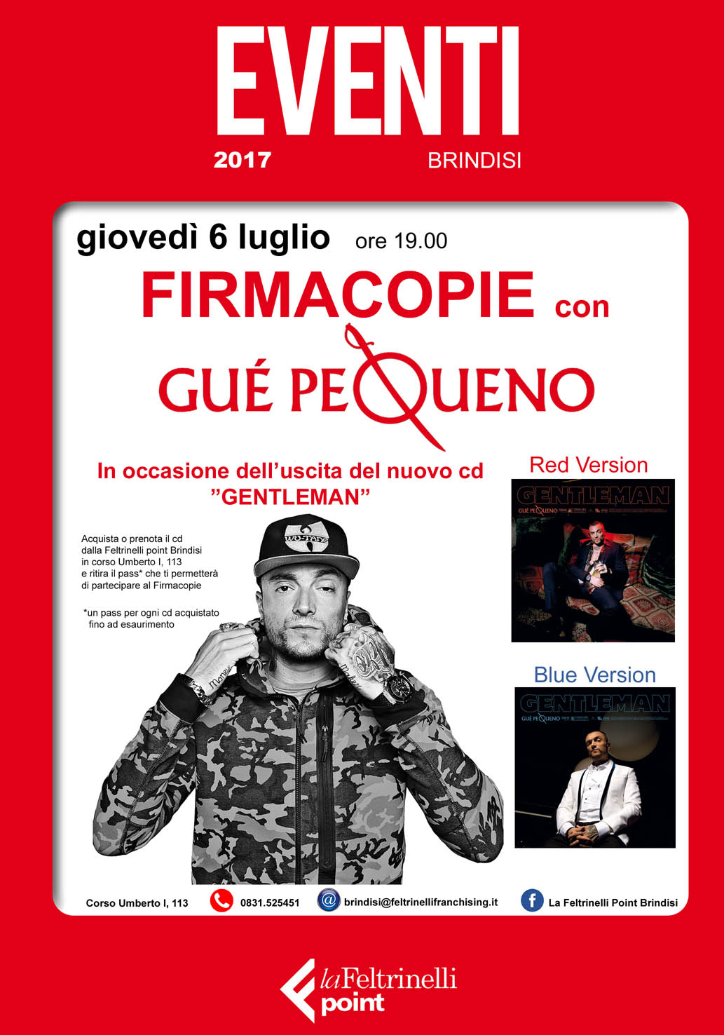 In occasione dell’uscita del suo nuovo cd “Gentleman”, Guè Pequeno sarà a Brindisi per incontrare il pubblico e firmare le copie del nuovo album. L’appuntamento è per giovedì 6 luglio, alle ore 19.00, presso la Feltrinelli point Brindisi, in corso Umberto I, 113.