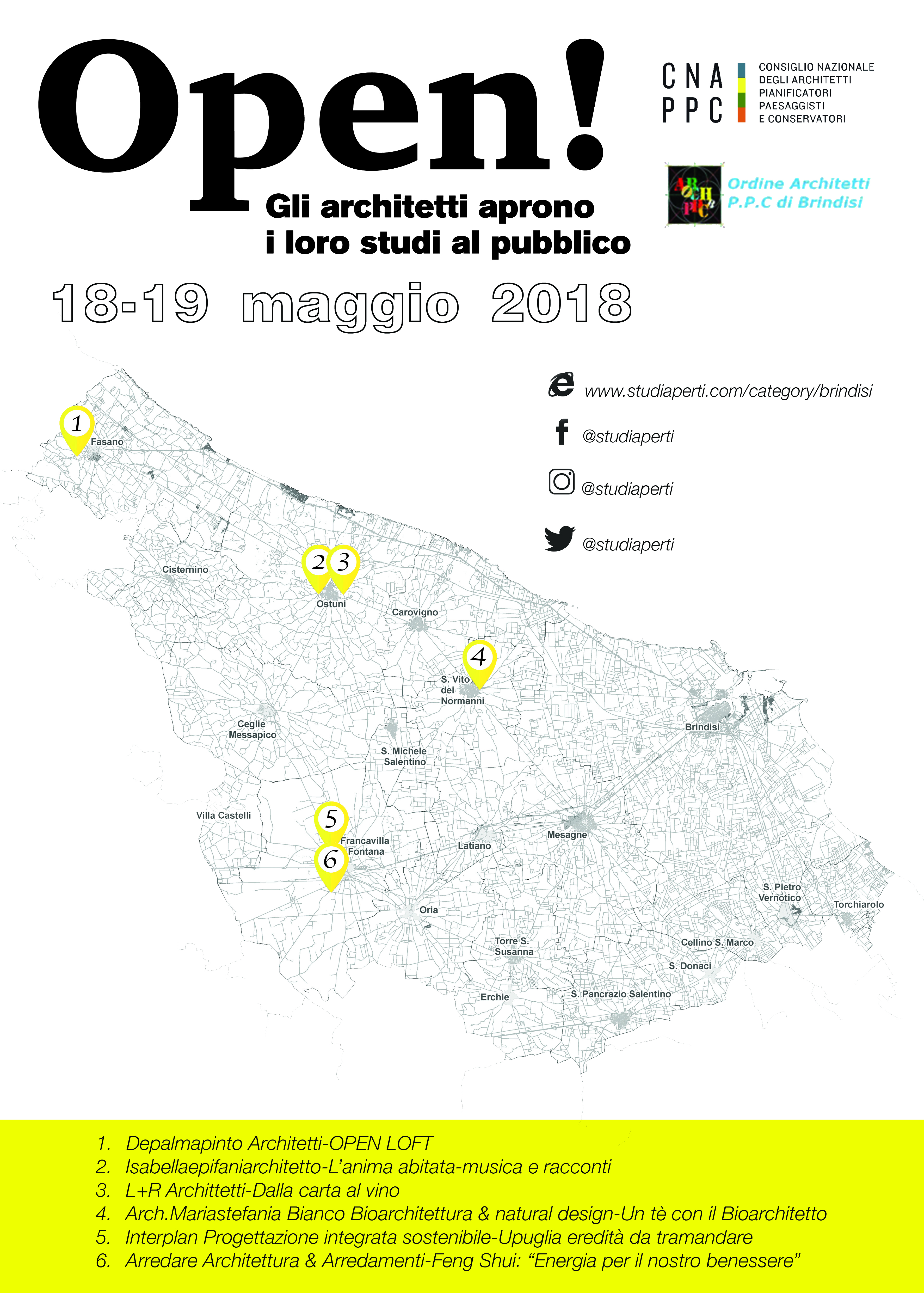 Il 18 e 19 maggio dalle ore 18 alle ore 22 anche gli Architetti della provincia di Brindisi partecipano alla seconda edizione della manifestazione Open! “Studi Aperti” organizzata, dal Consiglio Nazionale degli Architetti, Pianificatori, Paesaggisti e Conservatori e dagli Ordini territoriali, per diffondere la cultura architettonica e rinnovare la sensibilità nei confronti dell’ambiente, del paesaggio e dei territori.