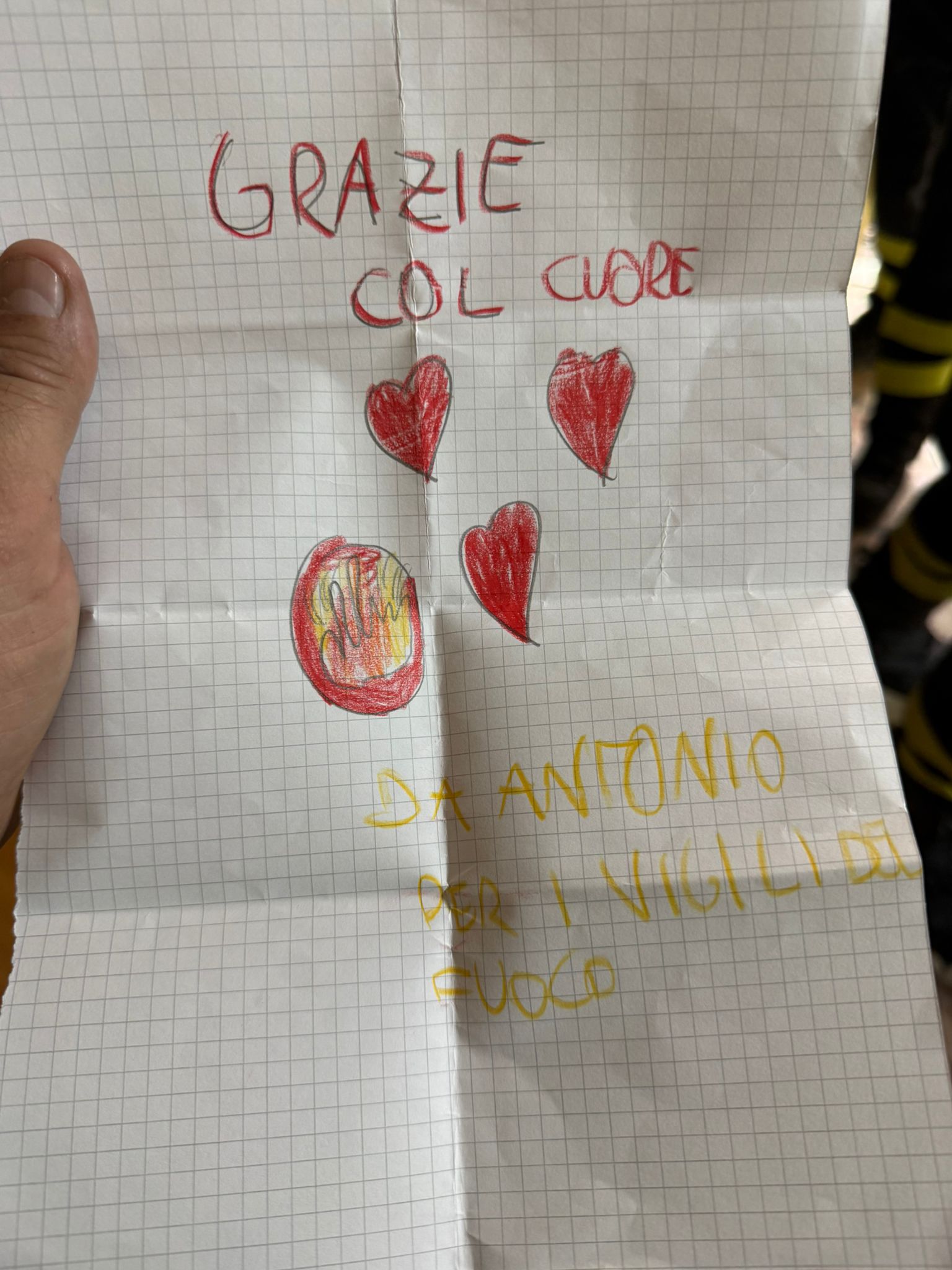 Mentre i pompieri stavano concludendo le operazioni, si è presentato davanti a loro un piccolo spettatore speciale: Antonio, un bambino che aveva atteso con pazienza la fine dei lavori per dire semplicemente “grazie”.
