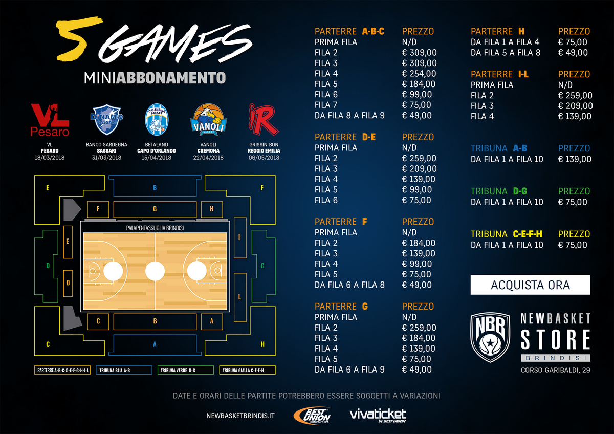 Si comunica che a partire dalle ore 17:00 di martedì 27 febbraio saranno in vendita i mini-abbonamenti validi per assistere alle ultime 5 partite interne di Lega A che la Happy Casa Brindisi disputerà all’interno delle mura amiche del PalaPentassuglia. A partire da €49 sarà possibile godere dal vivo dello spettacolo del massimo campionato di pallacanestro italiano e gridare sempre più #ForzaBrindisi!