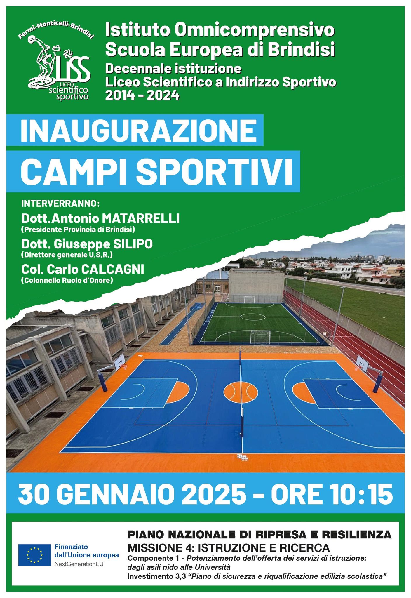 Giovedì 30 gennaio 2025, alle ore 10:15, presso l’auditorium “M. Maniglio” dell’Istituto Omnicomprensivo Scuola Europea di Brindisi (Liceo “Fermi-Monticelli”), in Via N. Brandi n.22, si terrà la celebrazione del decennale del Liceo Scientifico ad Indirizzo Sportivo, unico nella provincia e fiore all’occhiello per tutta la comunità scolastica. A seguire si svolgerà l’inaugurazione dei campi sportivi esterni di calcio, basket, pallavolo ed atletica leggera (salto in lungo e pista per i 100 metri a quattro corsie), realizzati con fondi PNRR.