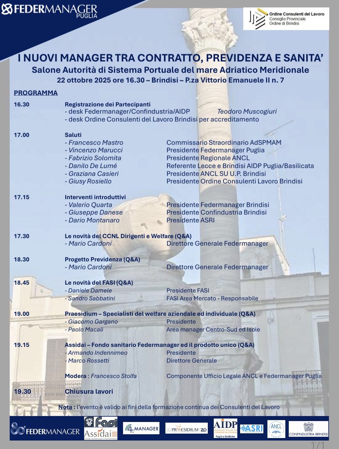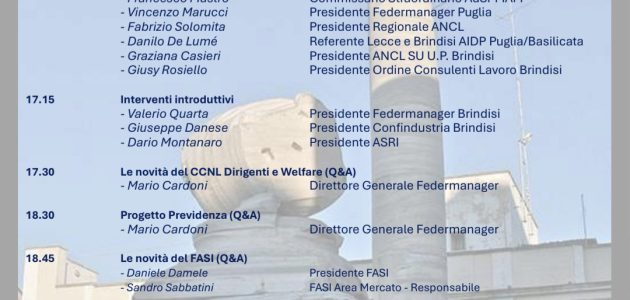 Dopo la registrazione dei partecipanti, sono previsti i saluti istituzionali di Francesco Mastro, Commissario straordinario dell’Autorità di Sistema Portuale, di Vincenzo Marucci, presidente Federmanager Puglia, di Fabrizio Solomita, presidente regionale ANCL, di Danilo De Lumè, referente AIDP Puglia-Basilicata per Lecce e Brindisi, di Graziana Casieri, presidente ANCL U.P. Brindisi e di Giusy Rosiello, presidente dell’Ordine dei Consulenti del Lavoro di Brindisi.