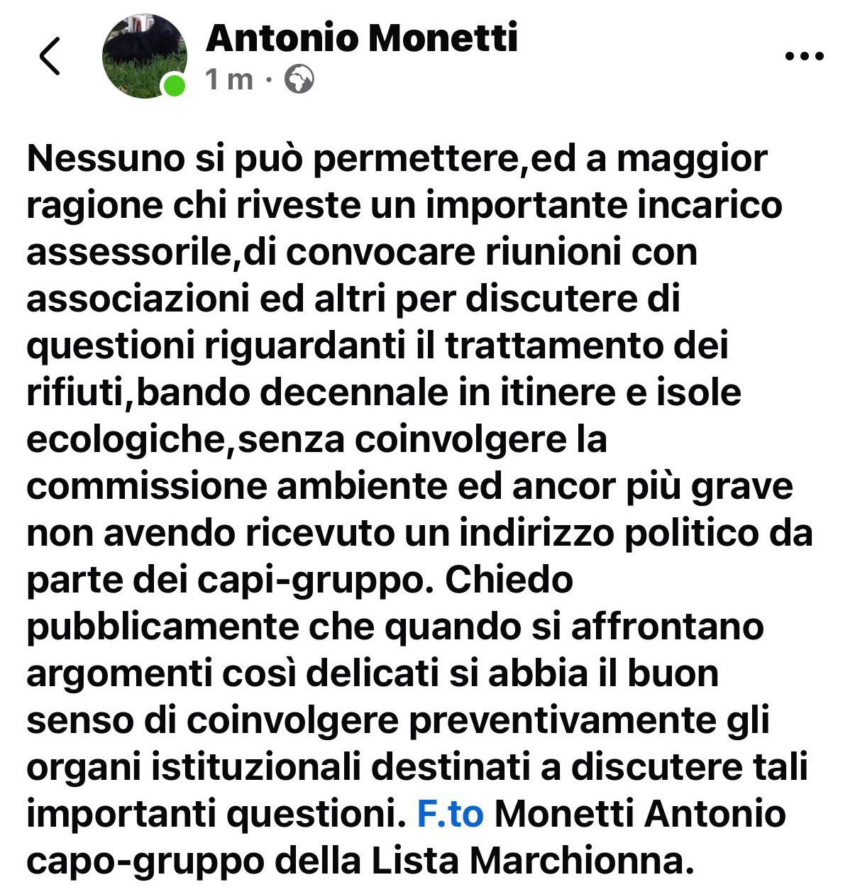 Si apre un nuovo fronte politico sulla gestione dell’ambiente a Palazzo di Città. A sollevarlo è un post pubblicato sui social dal capogruppo della Lista Marchionna, Antonio Monetti, che interviene sulla questione del bando decennale per il servizio di igiene urbana e sul metodo con cui vengono affrontati alcuni passaggi amministrativi.
