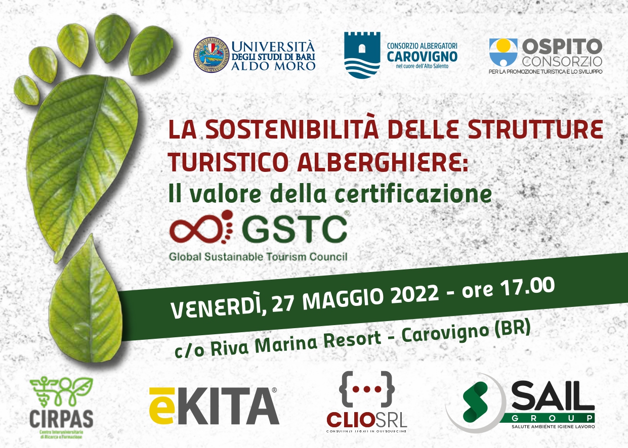 L’impronta ambientale del turismo è una delle grandi sfide nel futuro delle imprese di settore: il tema sarà oggetto di un convegno dal titolo “La sostenibilità delle strutture turistico alberghiere: il valore della certificazione GSTC” organizzato dal Consorzio Albergatori Carovigno e da Ospito Consorzio, in collaborazione con l’Università degli Studi di Bari Aldo Moro e con il Cirpas – Centro interuniversitario di ricerca presso Riva Marina Resort il 27 maggio 2022, alle ore 17.00.
