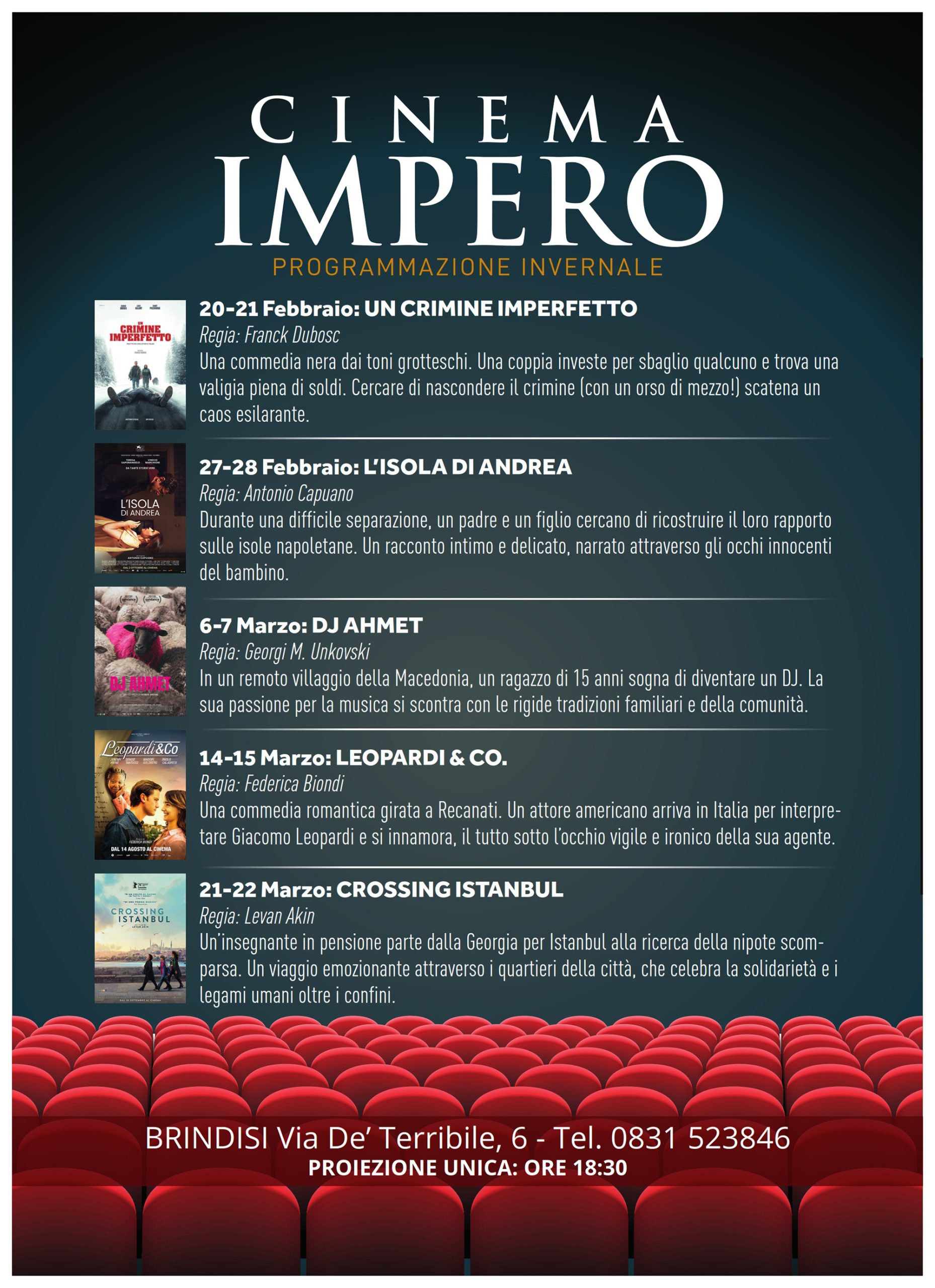 C’è un’idea di cinema netta che attraversa la programmazione invernale del Cinema Impero di Brindisi. Un cinema che non rincorre il presente ma lo interroga, che lavora sul tempo lungo delle storie, sulla loro capacità di depositarsi nello sguardo. Una proposta che chiede attenzione e restituisce senso. Tutti i film della rassegna sono in proiezione unica alle ore 18.30. Il biglietto intero è di 7 euro, il ridotto di 5 euro.