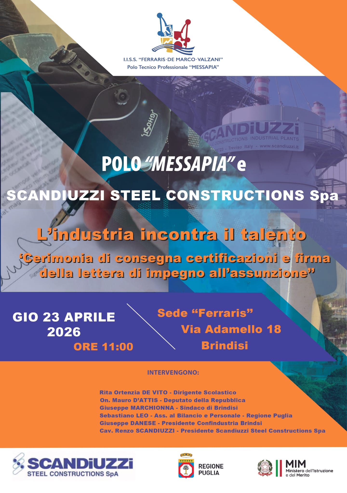 Quando la formazione di eccellenza incontra la lungimiranza industriale, il risultato non è solo un diploma, ma un contratto di lavoro immediato. È questo il messaggio forte che arriva dall’I.I.S.S. “Ferraris De Marco Valzani” – Polo Tecnico Professionale “Messapia”, che giovedì 23 aprile, alle ore 11.00, ospiterà presso la sede “Ferraris” di via Adamello 18 a Brindisi una giornata simbolo per il sistema educativo e produttivo pugliese.