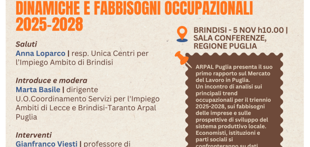 Il convegno, dal titolo “Il mercato del lavoro in Puglia: caratteristiche, dinamiche e fabbisogni occupazionali 2025-2028”, si svolgerà il 5 novembre alle 10:00 presso la sala conferenze della Regione Puglia a Brindisi e vedrà la partecipazione di istituzioni, accademici ed esperti del settore. L’incontro sarà introdotto e moderato dalla Dirigente U.O. Coordinamento Servizi per l’impiego Ambiti di Lecce e Brindisi-Taranto ARPAL Puglia, Marta Basile.