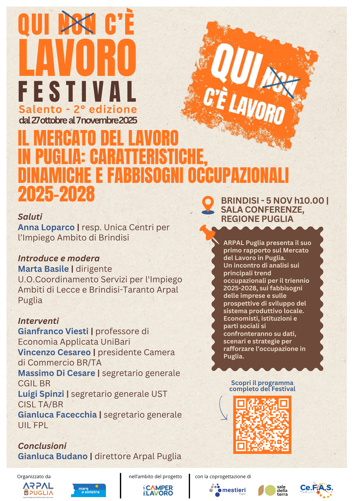 Il convegno si colloca all’interno di “Qui non c’è lavoro festival”, iniziativa promossa da Arpal Puglia con la coprogettazione di Consorzio Mestieri Puglia, Cefas e Sale della Terra, nell’ambito del progetto “Il Camper del Lavoro”, che si svolge dal 27 ottobre al 7 novembre .