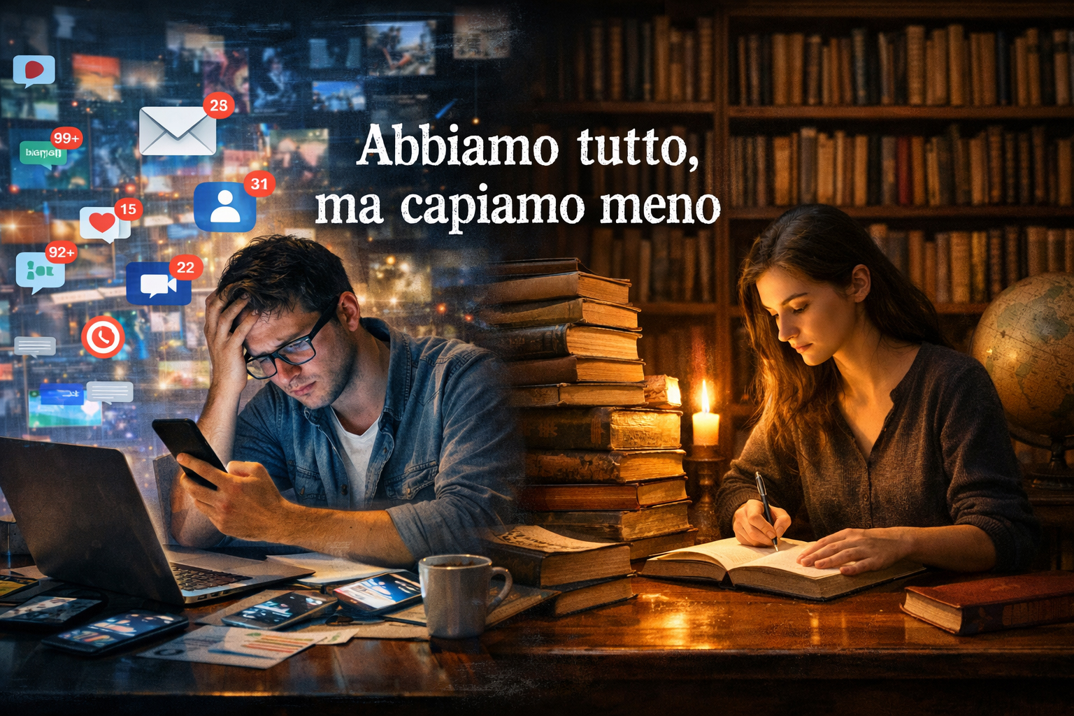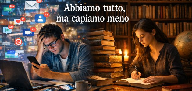 C’è una frase che molti adulti ripetono con un misto di nostalgia e amarezza: “Ai miei tempi, per sapere qualcosa, dovevo cercarla davvero”. Tutt’altro che memoria sentimentale. Dentro questo pensiero c’è un punto serio: un tempo l’accesso al sapere era più faticoso, ma proprio quella fatica selezionava, ordinava, sedimentava. Oggi invece l’informazione è ovunque, istantanea, inesauribile. Eppure non di rado la sensazione è opposta: più dati circolano, meno conoscenza resta.