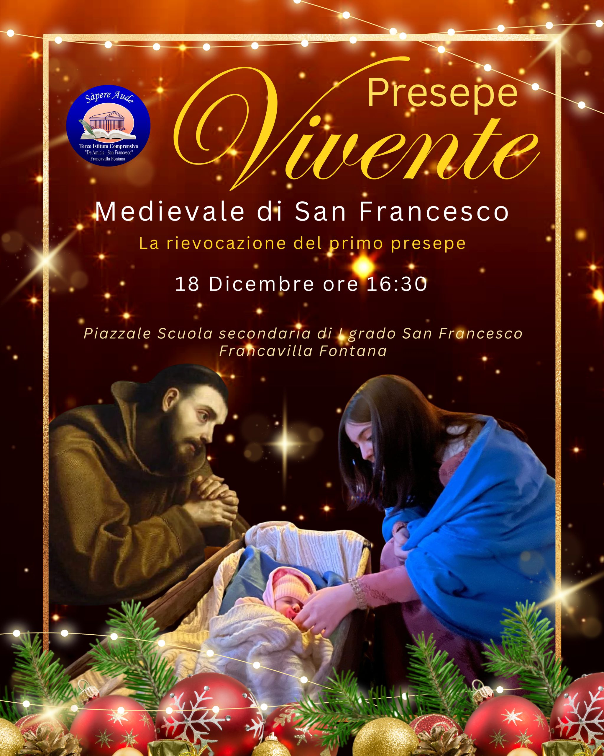 A seguire, gli studenti della “San Francesco d’Assisi”, in abiti d’epoca, daranno vita al Presepe Vivente, rievocando scene di vita quotidiana medievale in un percorso coinvolgente che unisce storia, spiritualità e partecipazione attiva. Un lavoro corale che valorizza la didattica e il senso di comunità, trasmettendo i valori francescani di pace, semplicità e fraternità.