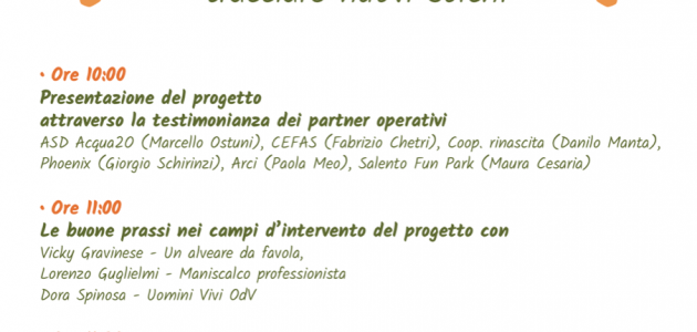 Durante l’evento interverranno i Partner operativi del progetto ed in particolare ASD Acqua2O (Marcello Ostuni), Ce.F.A.S. (Fabrizio Chetri), Rinascita Società Cooperativa Sociale (Danilo Manta), Phoenix Società Cooperativa Sociale (Giorgio Schirinzi), Arci Brindisi (Paola Meo), Salento Fun Park (Maura Cesaria). Attraverso le loro parole e la visione di un breve video scopriremo le attività svolte finora e quelle in programma nel prossimo futuro.