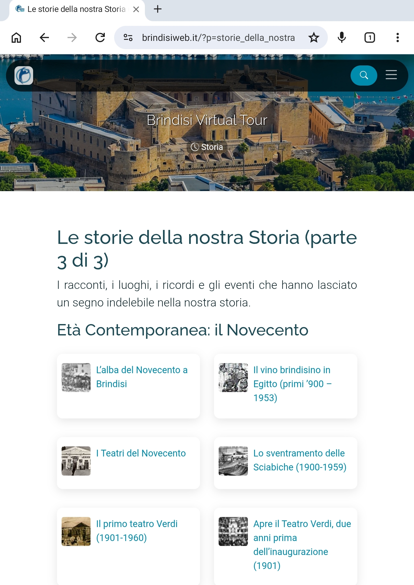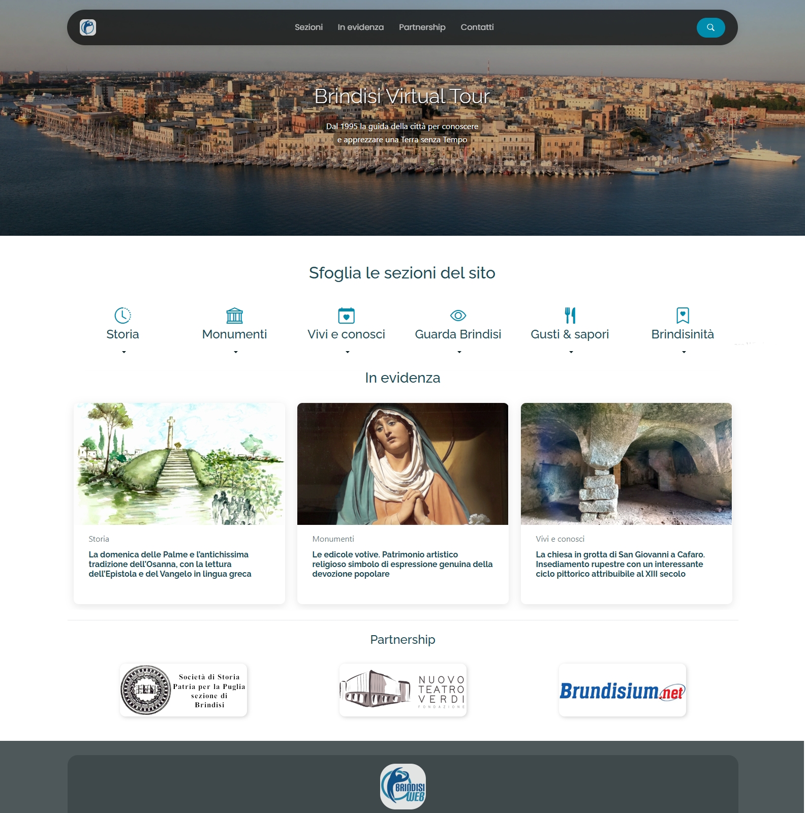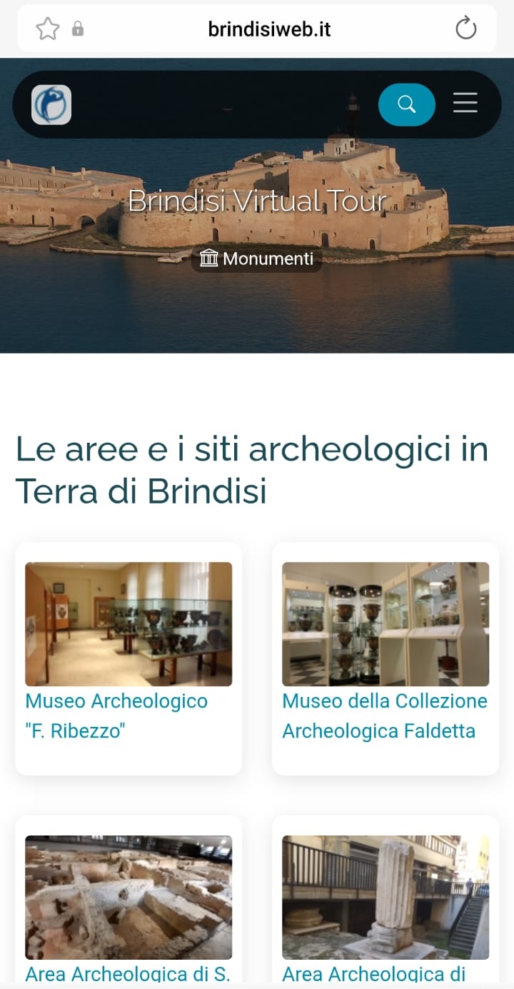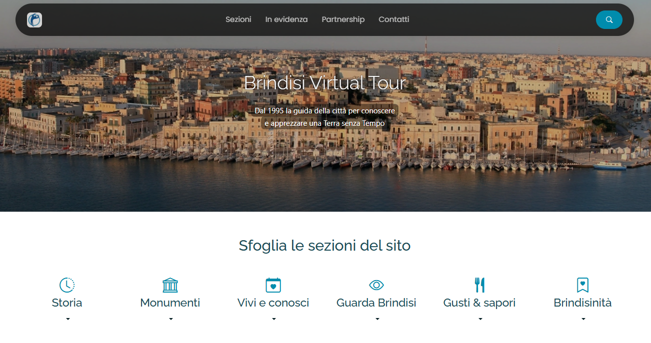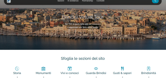 Nato nel 1995 dall’idea di Giovanni Membola e la preziosa collaborazione di Aldo Giove, Brindisi virtual tour (www.brindisiweb.it) è stato il primo sito web, in ordine di tempo, a rappresentare la città e a raccontare nei dettagli la sua affascinante storia millenaria. Si era agli albori di Internet, il collegamento era molto lento e avveniva attraverso un modem connesso alla linea telefonica fissa, eppure il sito riuscì a catturare l’attenzione di numerosi brindisini sparsi su tutto il globo terrestre.