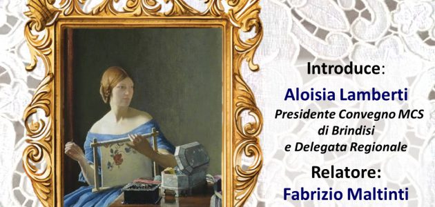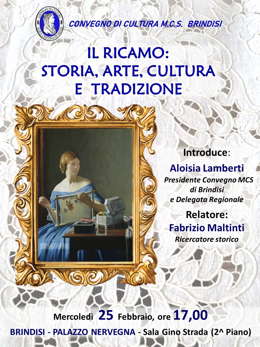 Il Convegno Maria Cristina di Savoia di Brindisi organizza per martedì 25 febbraio, alle ore 17.00, presso la Sala Gino Strada del Palazzo Nervegna, l’incontro dal titolo “Il ricamo, storia, arte, cultura e tradizione”.