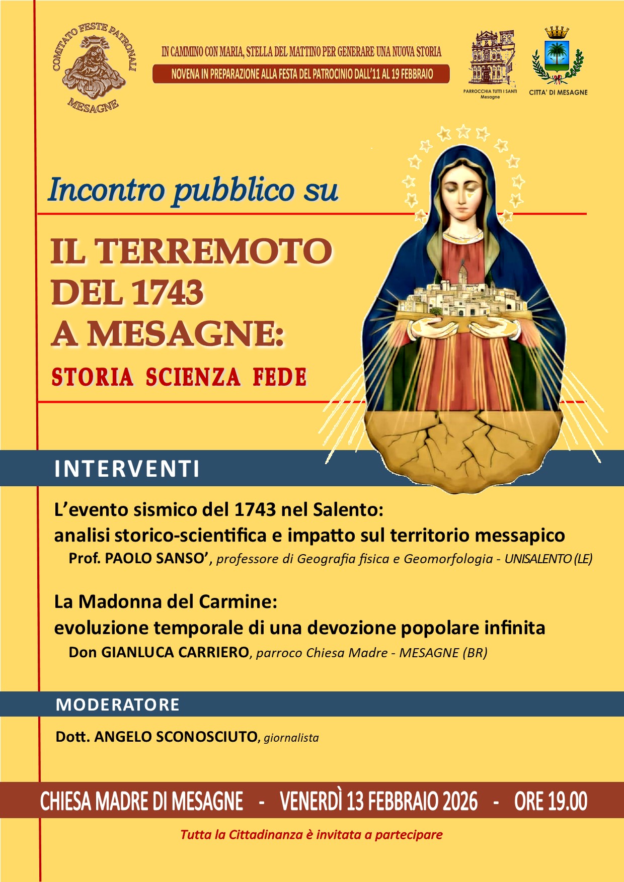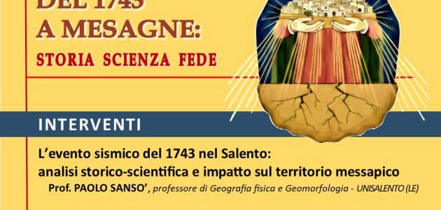 L’approfondimento storico-scientifico sarà affidato al Prof. Paolo Sansò (Professore di Geografia fisica e Geomorfologia presso UNISALENTO). Il Prof. Sansò approfondirà gli aspetti geologici e sismici del territorio, analizzando in particolare il catastrofico terremoto del 20 febbraio 1743. Attraverso il rigore della scienza, verranno esaminati gli effetti del sisma nel Salento e le peculiarità geologiche del territorio che rendono Mesagne un caso straordinario. La sua analisi dell’impatto sul territorio messapico evidenzierà come quell’evento ha segnato e trasformato la nostra terra.