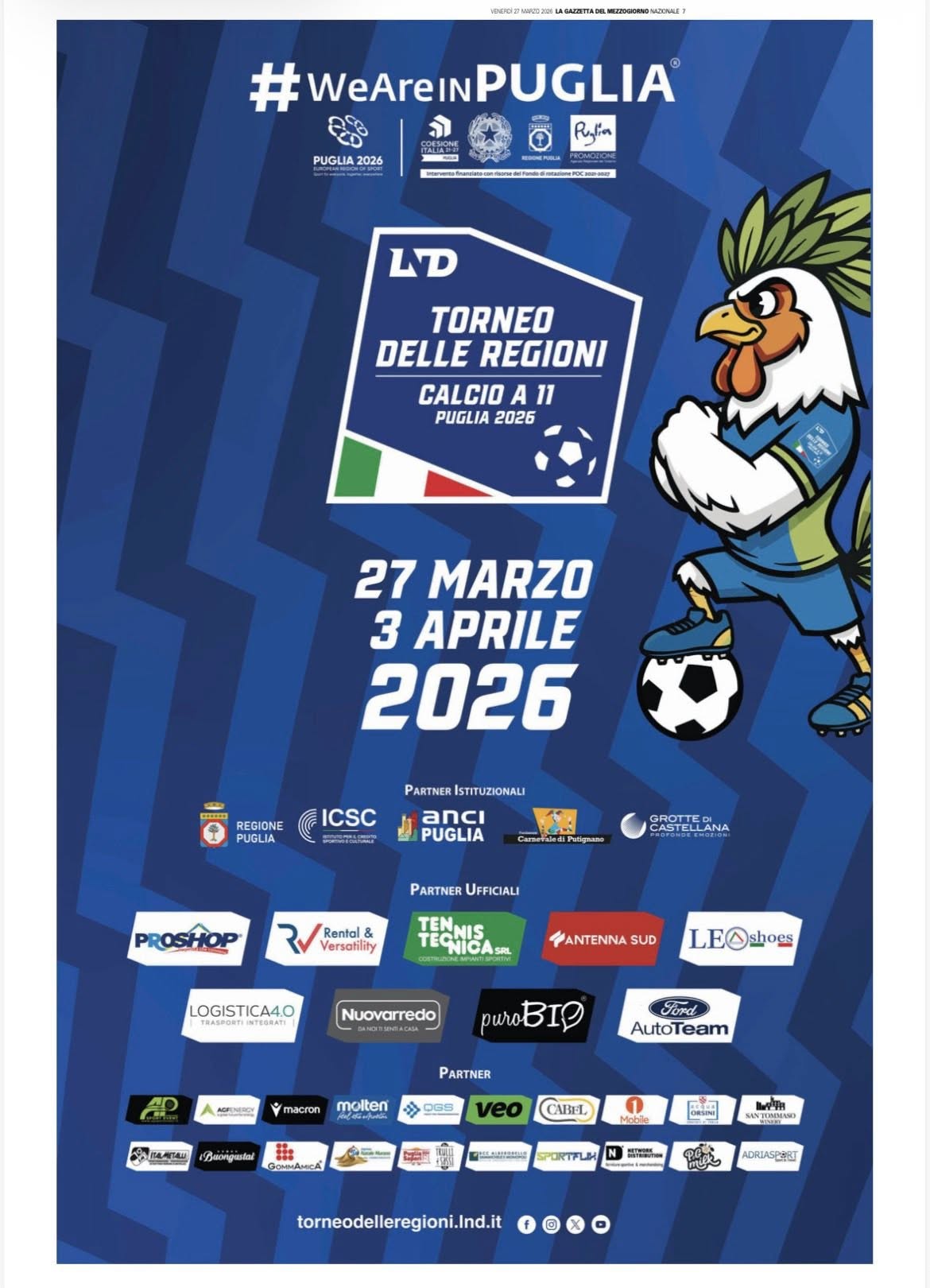 Al via da domani in Puglia l’edizione 2026 del Torneo delle Regioni di Calcio a 11, la prestigiosa kermesse della Lega Nazionale Dilettanti che mette a confronto le eccellenze dei settori giovanili di tutta Italia. Il Comune di Fasano sarà uno dei cuori pulsanti della manifestazione, ospitando presso lo stadio comunale “Vito Curlo” una serie di sfide decisive per le categorie Under 15, Under 17, Under 19 e Femminile.