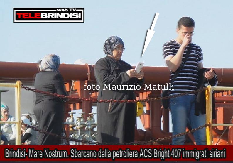 E’ l’immagine fermata da Maurizio Matulli, direttore di TeleBrindisi.tv, che ha pubblicato sul sito e sui suoi profili social una foto che ritrae una donna giunta a Brindisi con la nave “Acs Bright” assieme ad altri 406 migranti, mentre, con un palmare di ultima generazione, è impegnata a scattare foto e fare video dal ponte dell’imbarcazione.