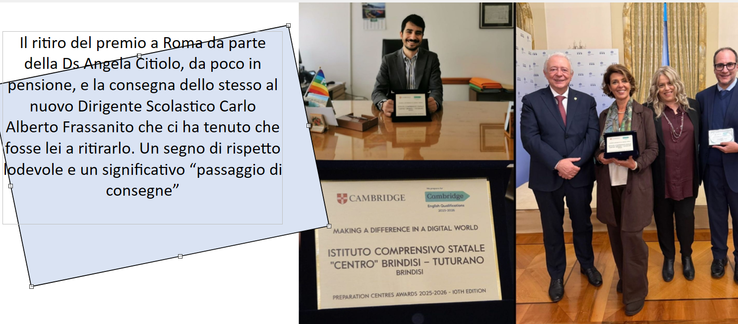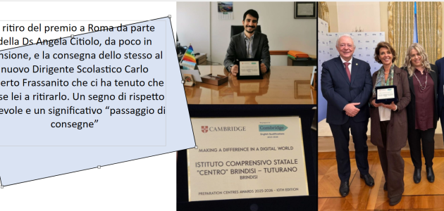 Un riconoscimento importante per la città di Brindisi: L’ISTITUTO COMPRENSIVO CENTRO BRINDISI – TUTURANO, supportato dalla International House di Lecce, ha ricevuto il premio in qualità di Cambridge Preparation Centre che si è distinto nella categoria “Making a difference in a digital world”, unica scuola statale individuata tra i vincitori.