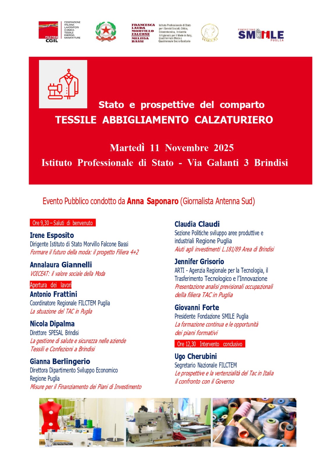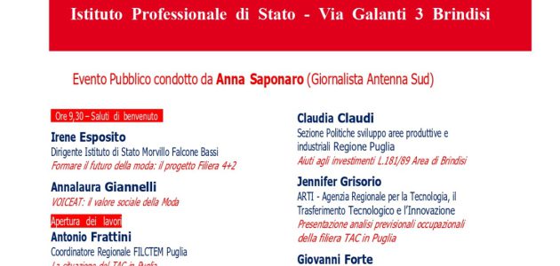 Con queste convinzioni la FILCTEM CGIL Puglia ha deciso di realizzare una specifica iniziativa pubblica sui temi del TAC, con l’Istituto Professionale di Stato, che ospita l’evento, VOICEAT, la Fondazione SMILE Puglia e importanti figure istituzionali che operano nel settore.