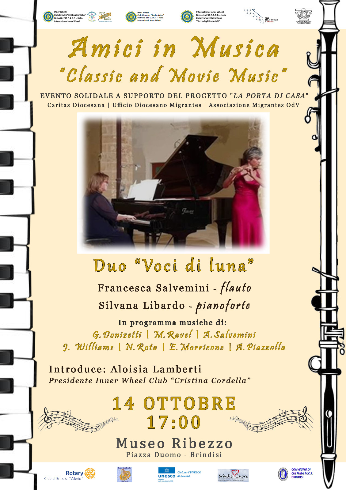 Il 14 Ottobre 2025 alle ore 17:00 presso il museo Ribezzo, il Club Inner Wheel “Cristina Cordella” in collaborazione con il Polo Biblio-Museale di Brindisi organizza un evento solidale musicale dal titolo: AMICI IN MUSICA “Classic and Movie Music” con il duo “Voci di luna” Francesca Salvemini – Flauto e Silvana Libardo – Piano.