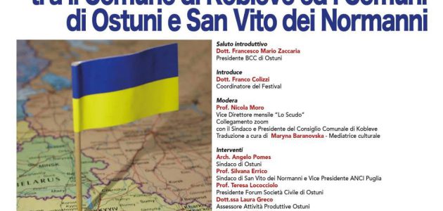 Nell’ambito della nona edizione del Festival della Cooperazione Internazionale, la Banca di Credito Cooperativo di Ostuni ospiterà un importante incontro dedicato alla firma e presentazione del Patto di Collaborazione tra il Comune di Kobleve (Ucraina) e i Comuni di Ostuni e San Vito dei Normanni.