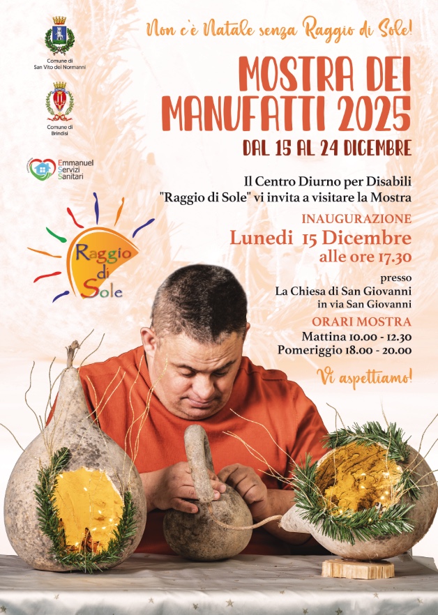 San Vito dei Normanni – L’attesa è quasi finita. La comunità si prepara ad accogliere un evento che coniuga creatività, inclusione sociale e rispetto per l’ambiente: l’inaugurazione della tradizionale Mostra di Manufatti e Presepi, interamente realizzati dai ragazzi del Centro Diurno Socio Educativo e Riabilitativo Raggio di Sole, gestito dalla Cooperativa Sociale Emmanuel Servizi Sanitari.