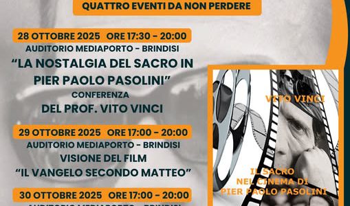 “Pier Paolo Pasolini – La Nostalgia del Sacro – A 50 Anni Dalla Morte” è il nome della rassegna che inizierà il 28 ottobre alle 17.30 nell’Auditorium Mediaporto di Brindisi con una conferenza del Prof. Vito Vinci.