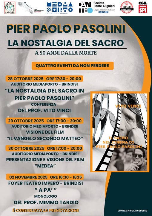 L’ultimo appuntamento si terrà il 2 novembre dalle 16.30 alle 18.15 nel foyer del teatro Impero con un monologo del Prof. Mimmo Tardio dal titolo “A Pa”. “Pier Paolo Pasolini – La Nostalgia del Sacro – A 50 Anni Dalla Morte” è un viaggio culturale tra parole, immagini e memoria per riscoprire un grande autore che ancora oggi ci interroga e ci ispira.